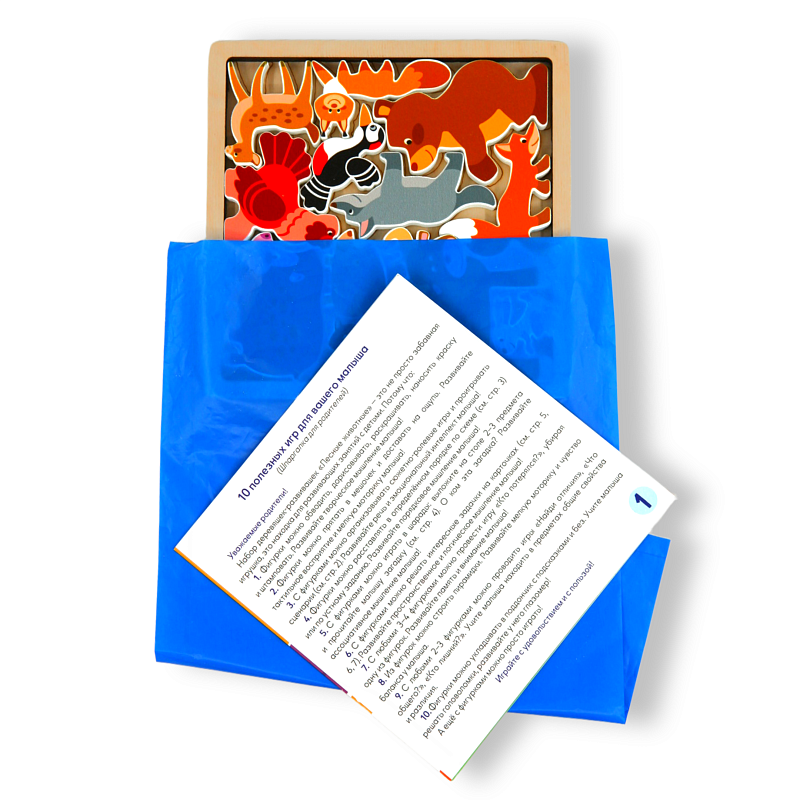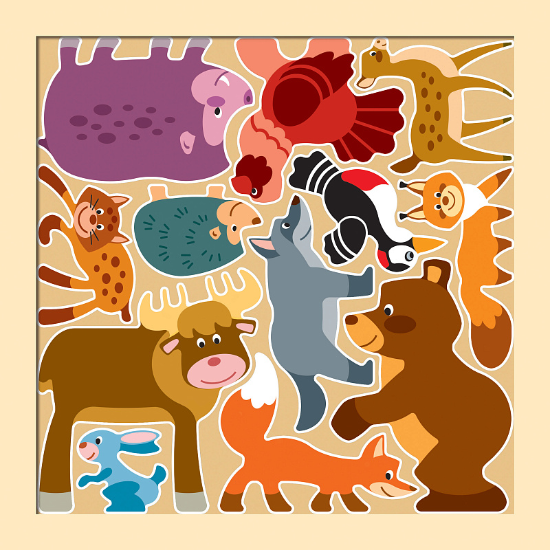 В комплект входят лёгкие и приятные на ощупь деревянные фигурки лесных зверей — медведя, лисы, ёжика, зайца, волка и других. Они легко встают на свои места в контурном планшете и отлично подходят для сюжетно-ролевых игр: можно придумать целую сказку про лес, погоду, друзей или прогулку.