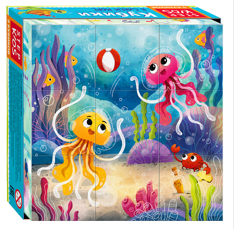 Набор из 9 кубиков размером 4×4 см. погружает ребёнка в морской мир: можно собрать черепашек, медуз, дружелюбного осьминога и других обитателей глубин. Крупные изображения помогают малышу лучше различать детали и составлять целостную картинку.