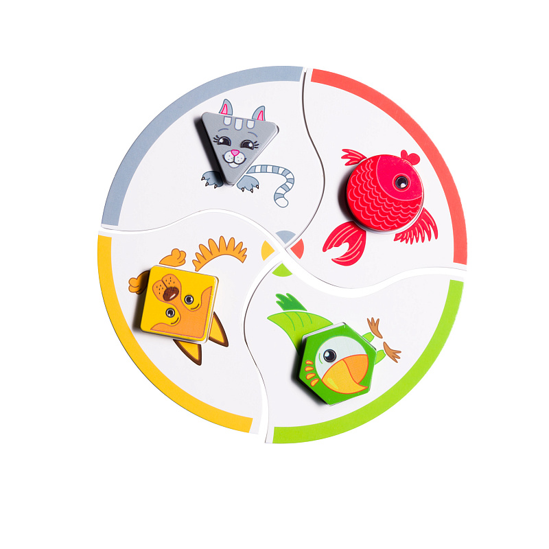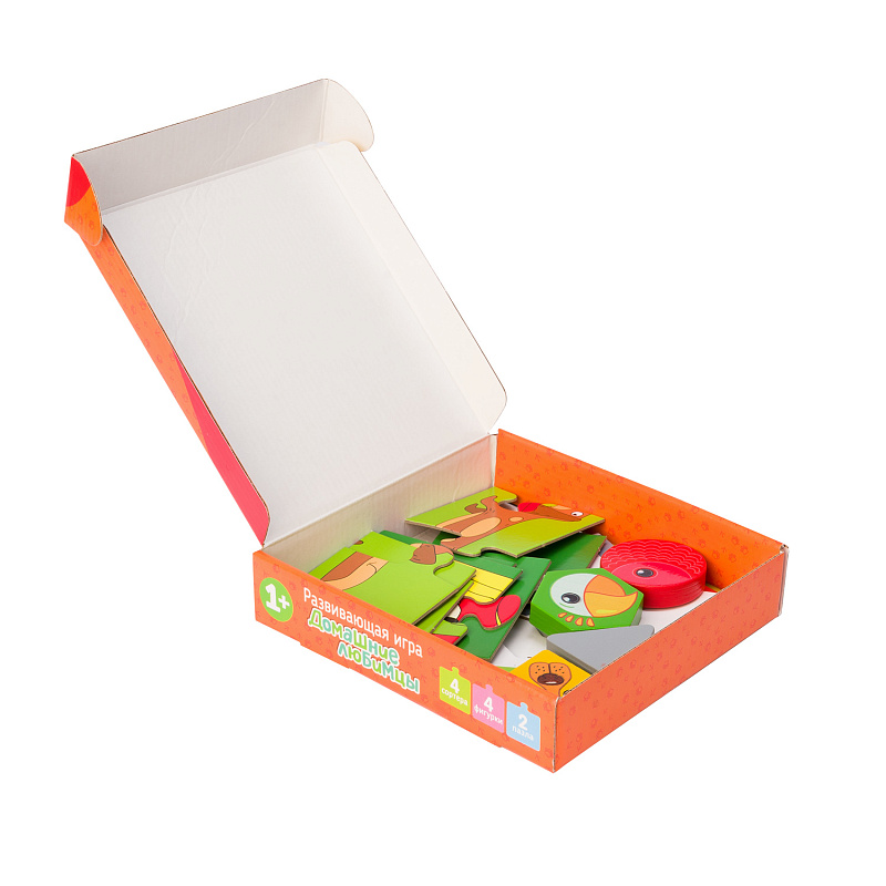 «Домашние любимцы» – развивающая игра для детей от 1 года. В одной коробке 2 игры! Познакомит с названиями домашних животных. Научит различать цвета и формы.