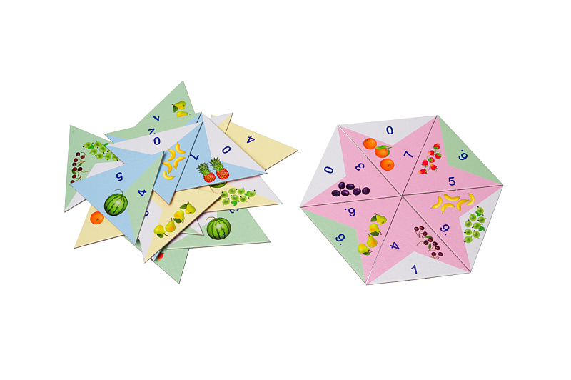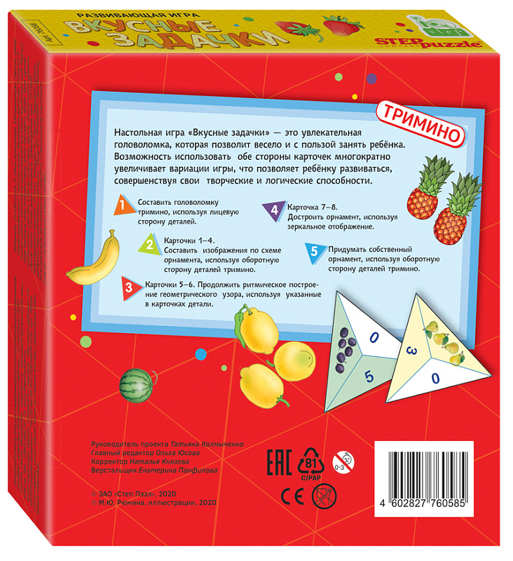 Тримино «Вкусные задачки» — это увлекательная головоломка. Узор на ее карточках нанесен с двух сторон: это усложняет задания, но вместе с тем делает игру в разы интереснее. В комплект игры входят также карточки с заданиями, по ним ребенок сможет составлять разные узоры из игровых карточек тримино.