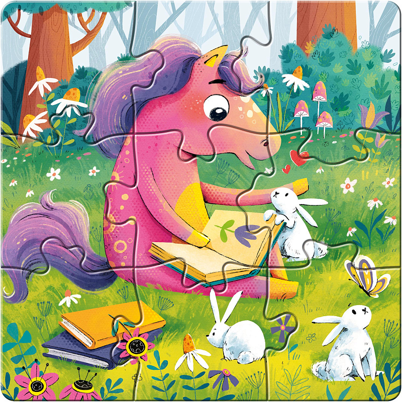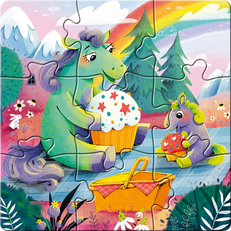 Набор «Милые пони» — это три добрых, нежных сюжета с забавными пони. Всего 27 деталей, разделённых на 3 пазла по 9.