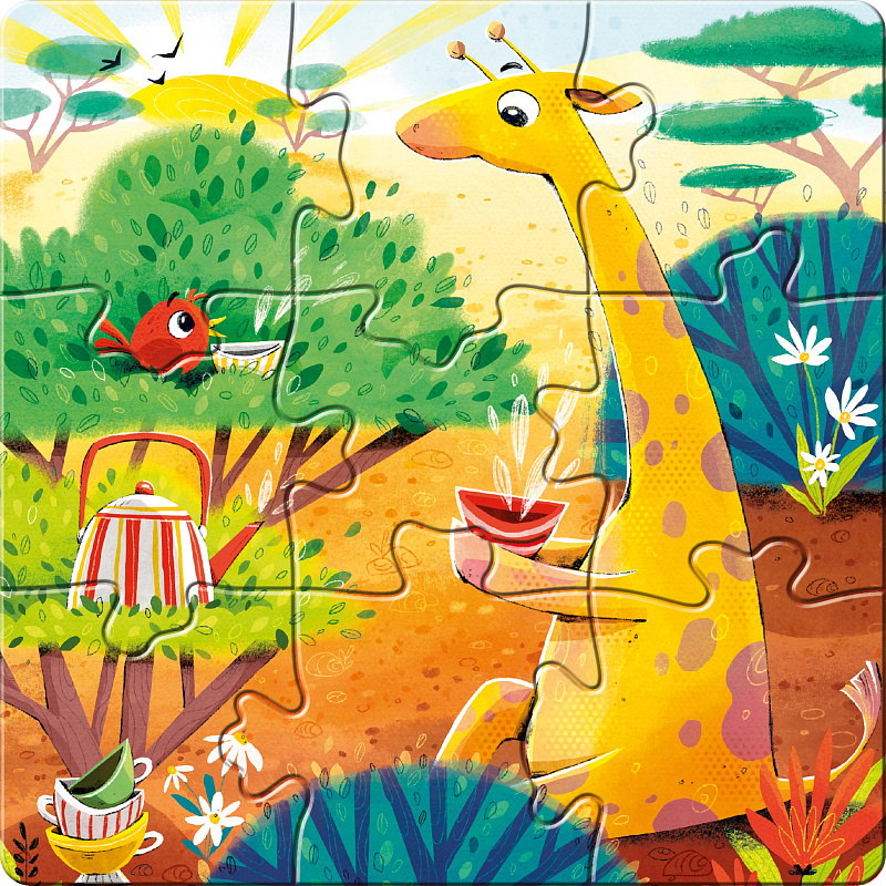 «Весёлые зверята» — компактный набор из 3 пазлов, каждый по 9 деревянных элементов. Всего 27 деталей с изображениями милых животных в смешных сценках.