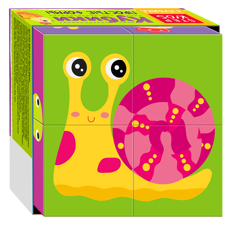 Этот набор из 4 кубиков (каждый 4×4 см.) помогает детям с 2 лет знакомиться с базовыми формами через узнаваемые образы: улитку, рыбку и черепаху. Интуитивно понятные изображения стимулируют мышление и становятся первым шагом к сложным сборкам.