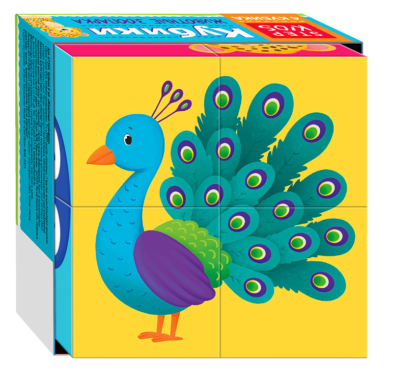 Набор из четырёх кубиков (каждый 4×4 см.) приглашает ребёнка собрать изображения коалы, пингвина, павлина и другие. За счёт небольшого количества элементов процесс не вызывает трудностей у малышей с 2 лет, но при этом тренирует наблюдательность и пространственное мышление.