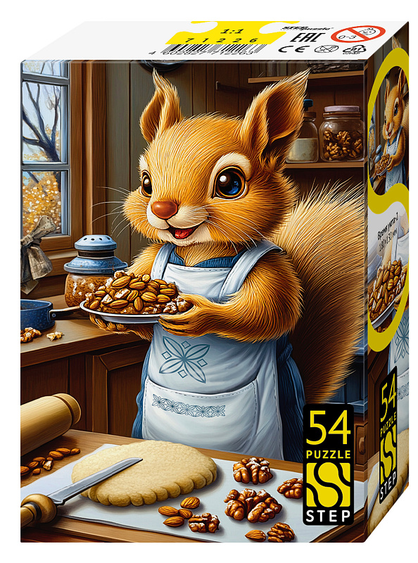 На иллюстрации — уютная сцена с персонажами, которые легко вызывают симпатию: мишка, лиса, собака, сова и белочка заняты домашними делами. Постепенно соединяя детали, ребёнок наблюдает, как из отдельных фрагментов появляется живая и яркая композиция с множеством милых деталей, которые хочется рассматривать снова и снова.