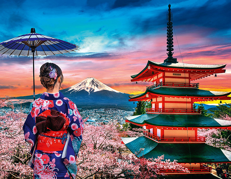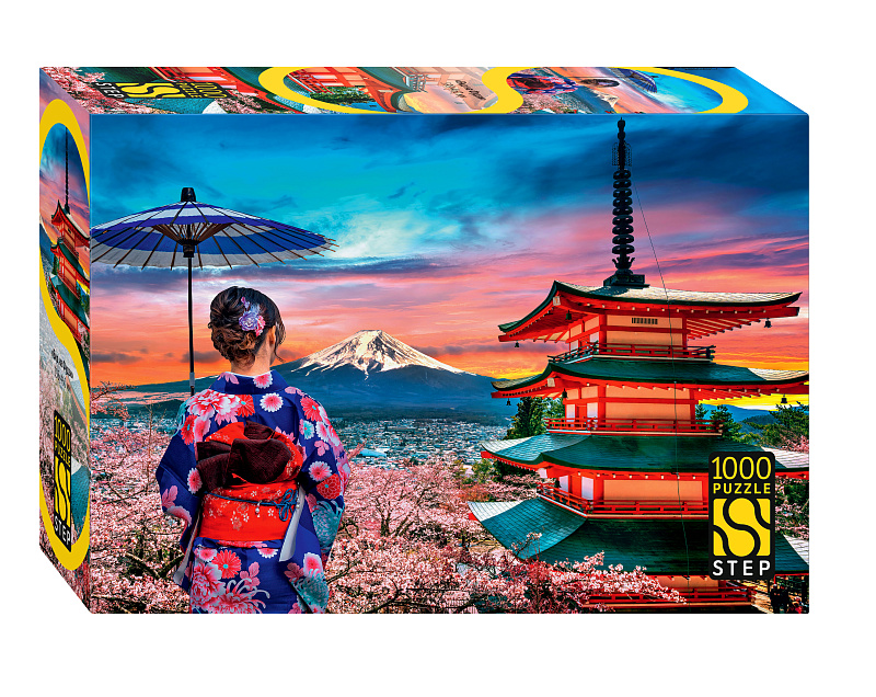 Изящная композиция из 1000 деталей "Вид на Фудзи" раскрывает перед вами картину Японии: прекрасная девушка в традиционном кимоно созерцает величественную гору Фудзи. Этот пазл — настоящее окно в мир восточной философии и красоты.