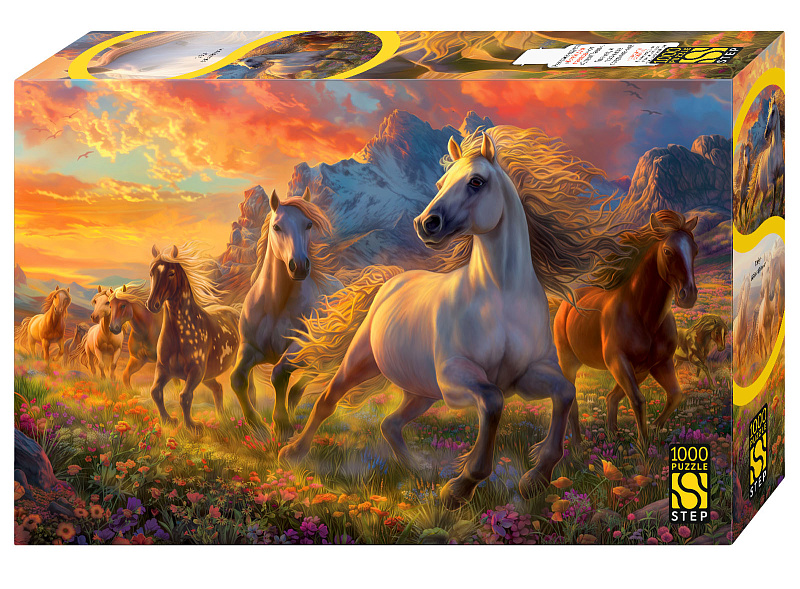 Эффектный пазл из 1000 деталей "Табун" собирается в картину размером 480×680 мм. На ней изображён табун свободных лошадей, мчащихся по цветущему лугу на фоне величественных гор и пылающего заката. Яркие краски, динамика движения и внимание к деталям превращают процесс сборки в настоящее эстетическое удовольствие.