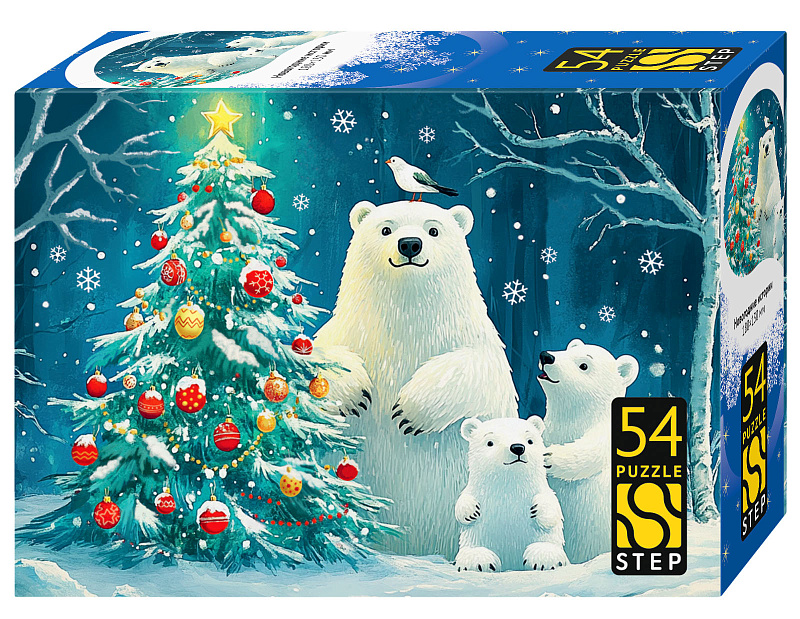 Пазл на 54 детали — это маленькое чудо с зимним настроением. Собранная картинка размером 180 × 130 мм. представляет разные праздничные сюжеты: уютный пряничный городок, любопытного котёнка, озорного щенка, доброго Деда Мороза с оленем и весёлых белых медвежат.