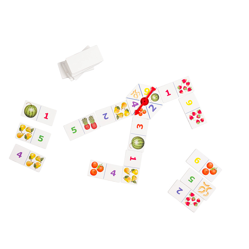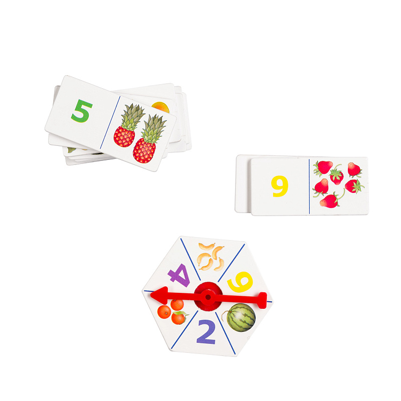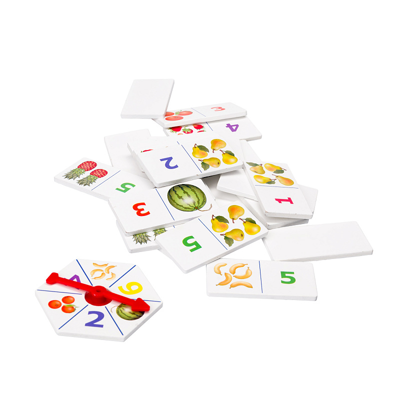 Игра из дерева «Фруктовый счёт» — развивающая игра для детей от 5 лет. Вариант деревянного домино с вращающейся стрелкой. Научит считать до шести. Поможет освоить основные математические понятия «цифра» и «количество» и сопоставлять их.