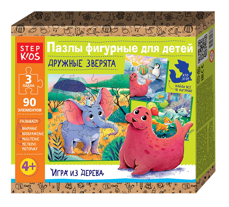 Пазлы деревянные: набор из трёх пазлов 30 эл. "Дружные зверята" (StepKids)