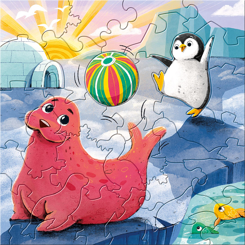 Набор «Дружные зверята» — это три сюжета о приключениях слона, тюленя, пингвина и других героев.