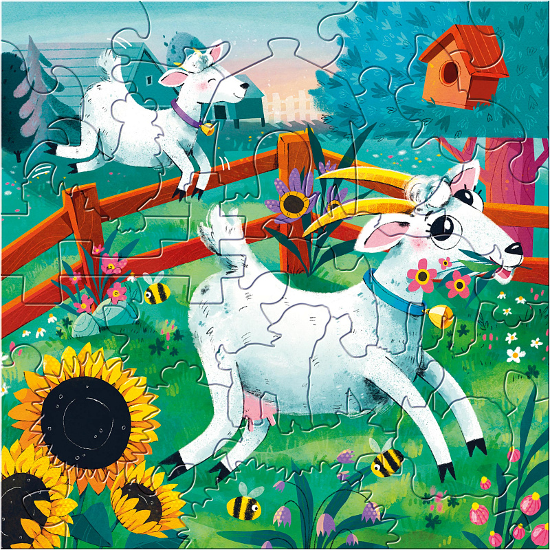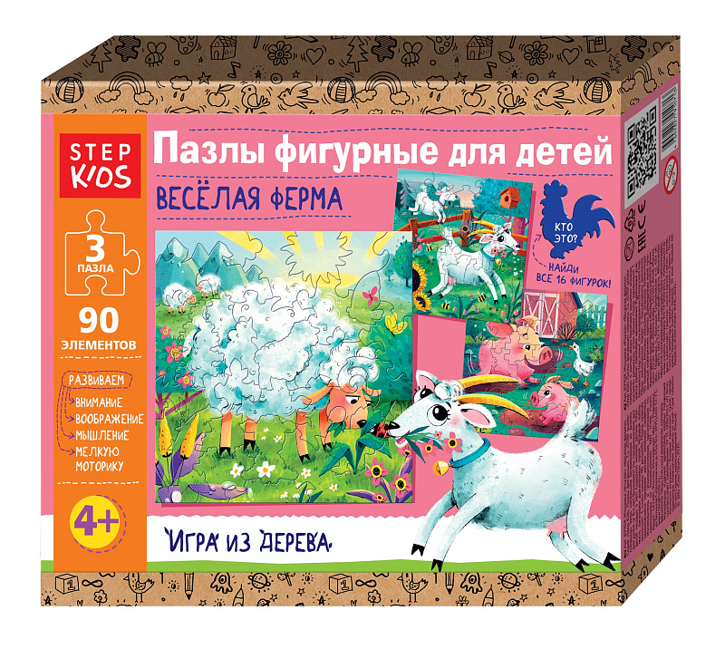 Набор из трёх фигурных пазлов «Весёлая ферма» приглашает ребёнка в мир домашних животных и спокойного деревенского ритма.