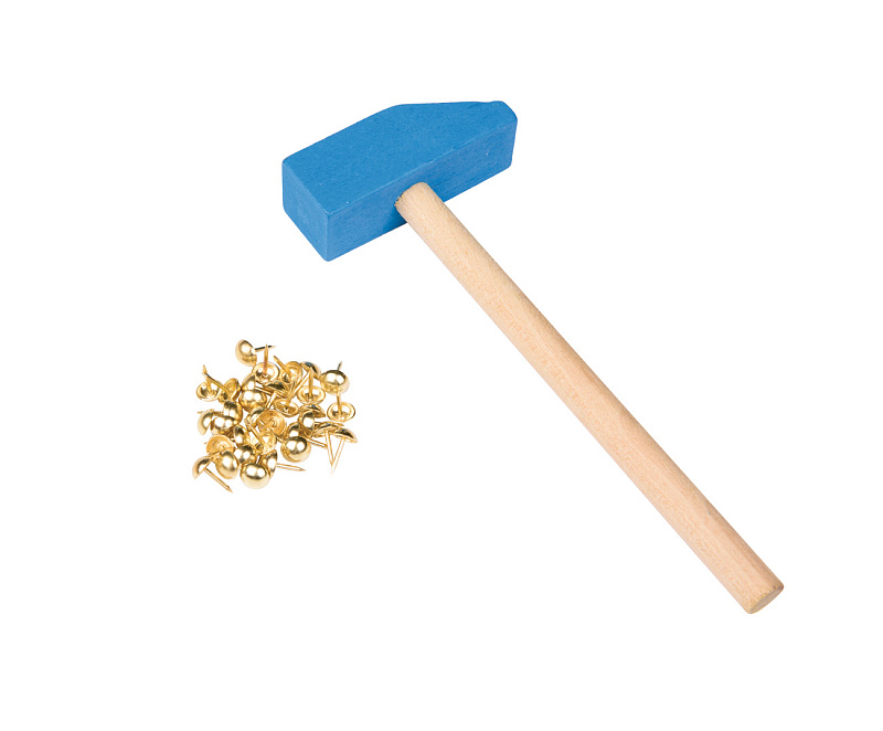 - 1 деревянный молоточек. Он безопасен для ребенка и не содержат металлических частей, но при этом легко вбивает гвоздики в основу. Играя с таким молоточком, ребенок не причинит себе травму.