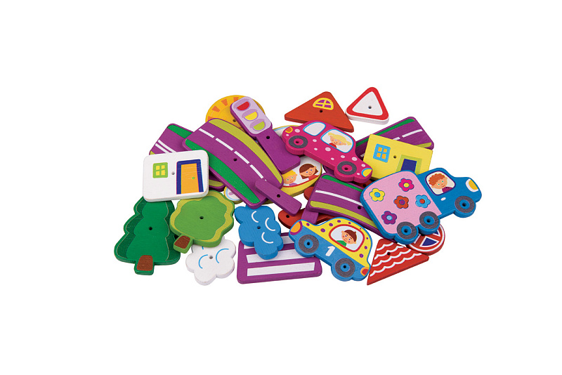 - 24 деревянные детали: машинки, самолеты, деревья, светофор, дорожная разметка и т.д. В каждой детали сделана дырочка, чтобы вставлять гвоздик и прибивать её к основе.