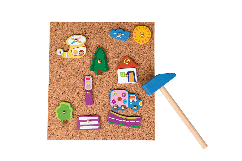 Задача игры - составлять картины из деревянных деталей и прибивать их молоточком к пробковой основе.