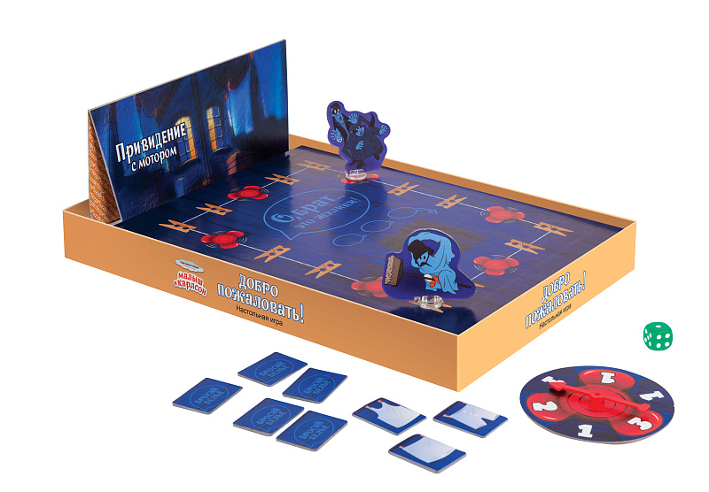Участники игры по очереди бросают кубик и передвигают фишку «Привидение с мотором» по игровому полю согласно выпавшему числу очков на грани кубика.