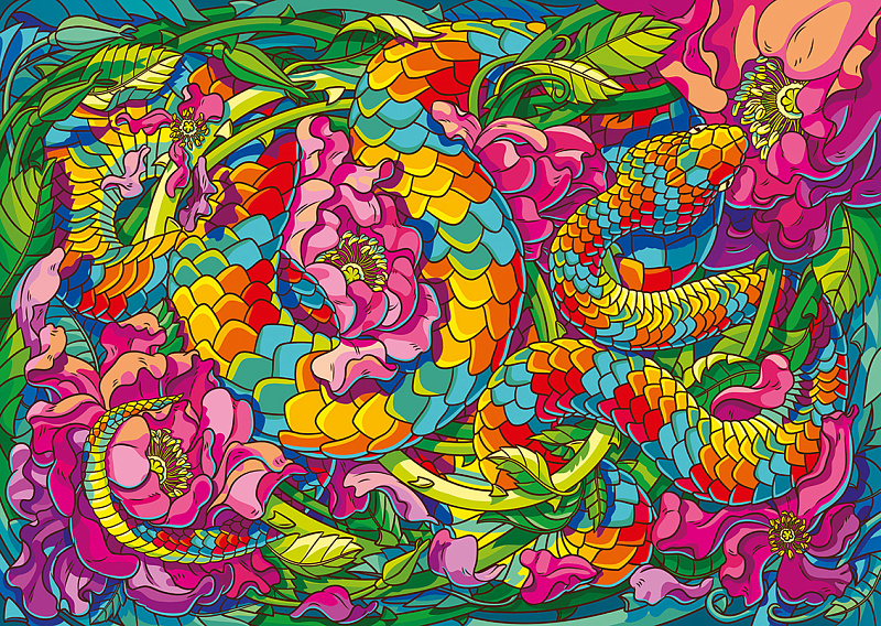 На яркой картине изображена грациозная змея, окружённая яркими цветами, символизирующая мудрость, обновление и трансформацию. Пазл «Змея» - это идеальное сочетание сложности и элегантности, которое станет настоящим вызовом для любителей головоломок.