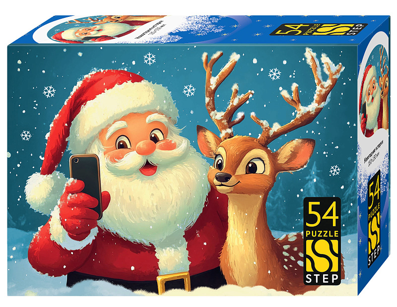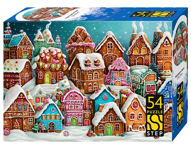 Пазл на 54 детали — это маленькое чудо с зимним настроением. Собранная картинка размером 180 × 130 мм. представляет разные праздничные сюжеты: уютный пряничный городок, любопытного котёнка, озорного щенка, доброго Деда Мороза с оленем и весёлых белых медвежат.